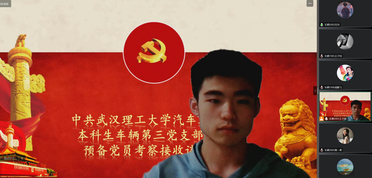 为高效落实党总支的党员发展工作要求以及车三党支部每年上半年培养预备党员发展对象的工作安排,及时了解各预备党员候选人自确定为入党积极分子以来在政治修养、工作能力、学习生活等方面的相关情况,5月9日20时,本科车辆第三党支部2023年上半年组织预备党员发展谈话采取线上会议的形式顺利开展。本次会议由王子铭同志主持,7名党员代表参与会议。