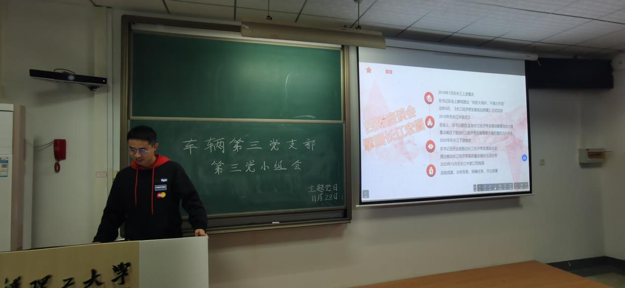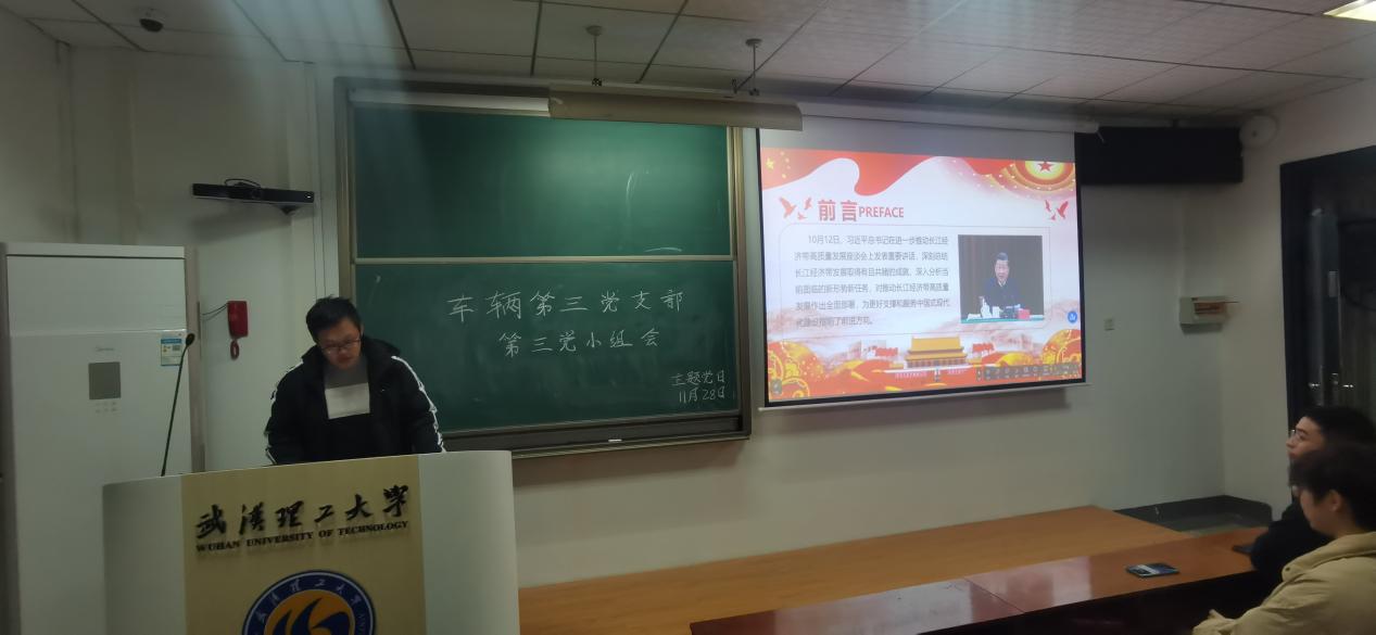 为深入开展学习贯彻习近平新时代中国特色社会主义思想主题教育,深刻领悟习近平总书记近期重要讲话精神,本科车辆第三党支部第三党小组于11月28日18时30分在致远楼307教室召开党小组会议,会议主题为“学习习近平总书记在进一步推动长江经济带高质量发展座谈会上的重要讲话”。会议由张骞同志主持,全体党员及预备党员参会。