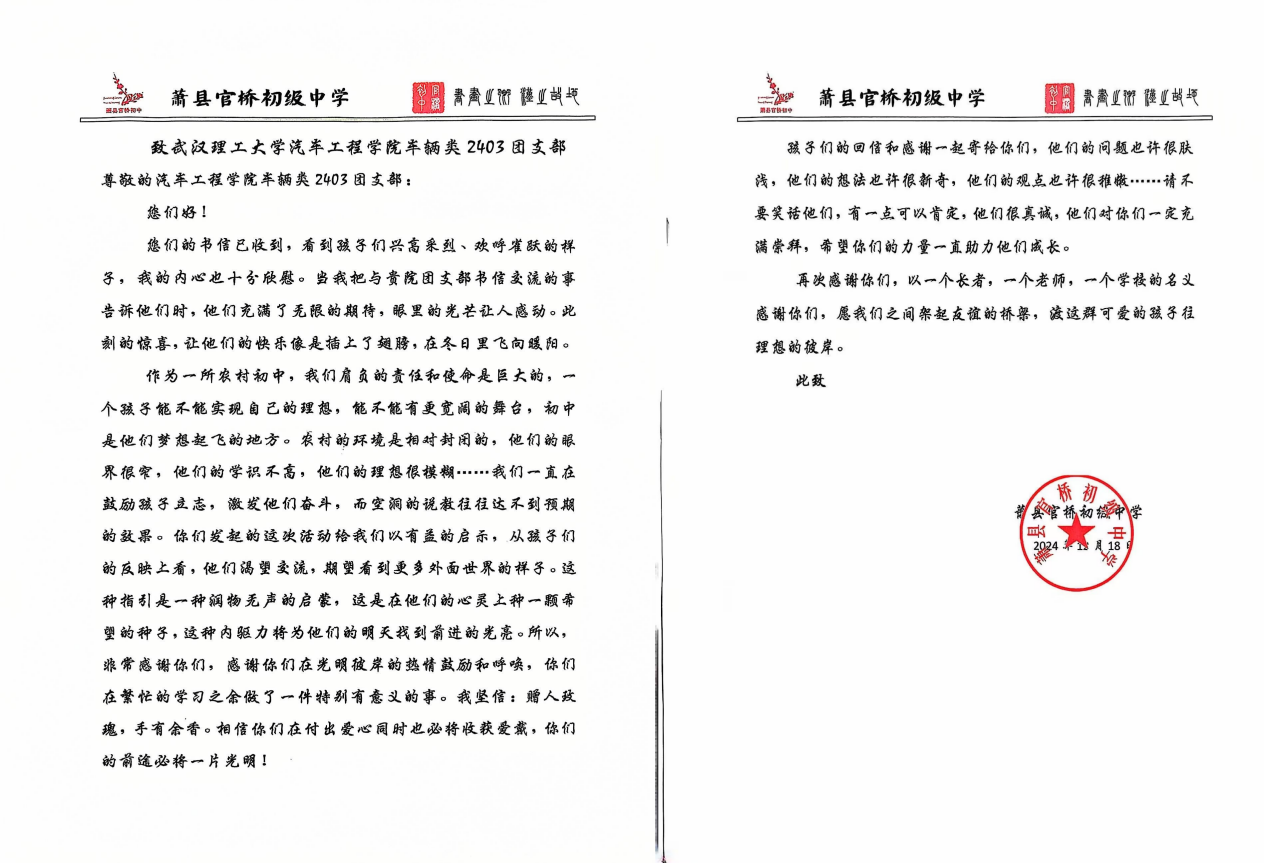 官桥初级中学的师生们收到信件后,反响热烈。他们被2403班同学们的真诚所感动,纷纷表示感谢,并回信表达了对武汉理工大学同学们的敬意和友谊。通过这次活动,两校之间的联系更加紧密,友谊的种子在两地生根发芽。
