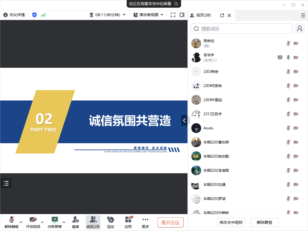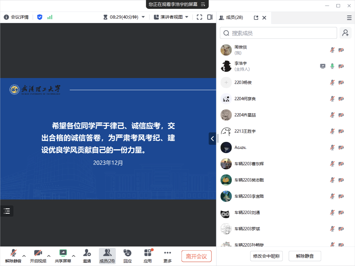 为端正同学们的学习态度,提升学习效率,激发备考热情,增强诚信应考意识,12月28日下午3时,车辆2203班于线上开展“积极备考,诚信应考”主题班会,本次会议由车辆2203班班长李浩宇主持,车辆2203班全体成员与会。