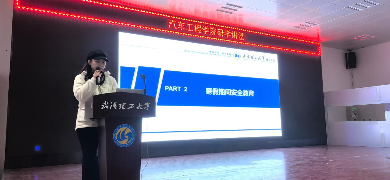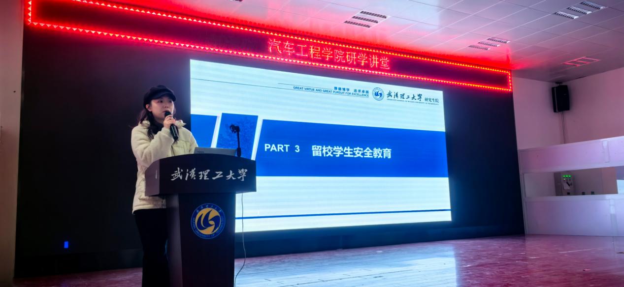 为进一步加强寒假安全教育,提升研究生的安全防范意识,保障学习、科研和生活的安全,1月9日下午,汽车工程学院在就业大楼东风厅举办1月份研学讲堂。本期讲堂重点围绕研究生寒假安全及留校安全教育展开,研究生辅导员潘鹏、向黎、杨佳三位老师与会,全体研究生参会。