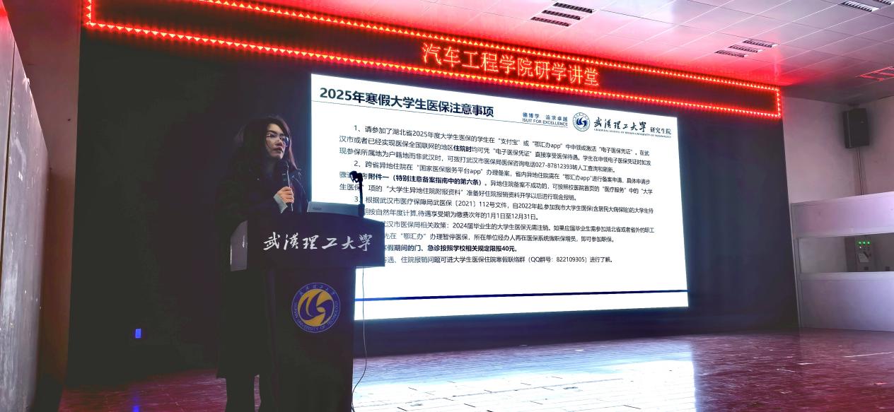 其次,向老师对寒假留校研究生的安全问题进行补充强调,希望留校研究生增强安全观念,提高安全防范能力,做好宿舍、实验室卫生及安全维护,每天向导师汇报个人学习和生活情况。随后,向老师提醒同学们留意2025年寒假大学生医保注意事项,并对学生校外门诊医疗费报销事项进行讲解,提醒同学们平时注意保暖、适量运动、预防流感。