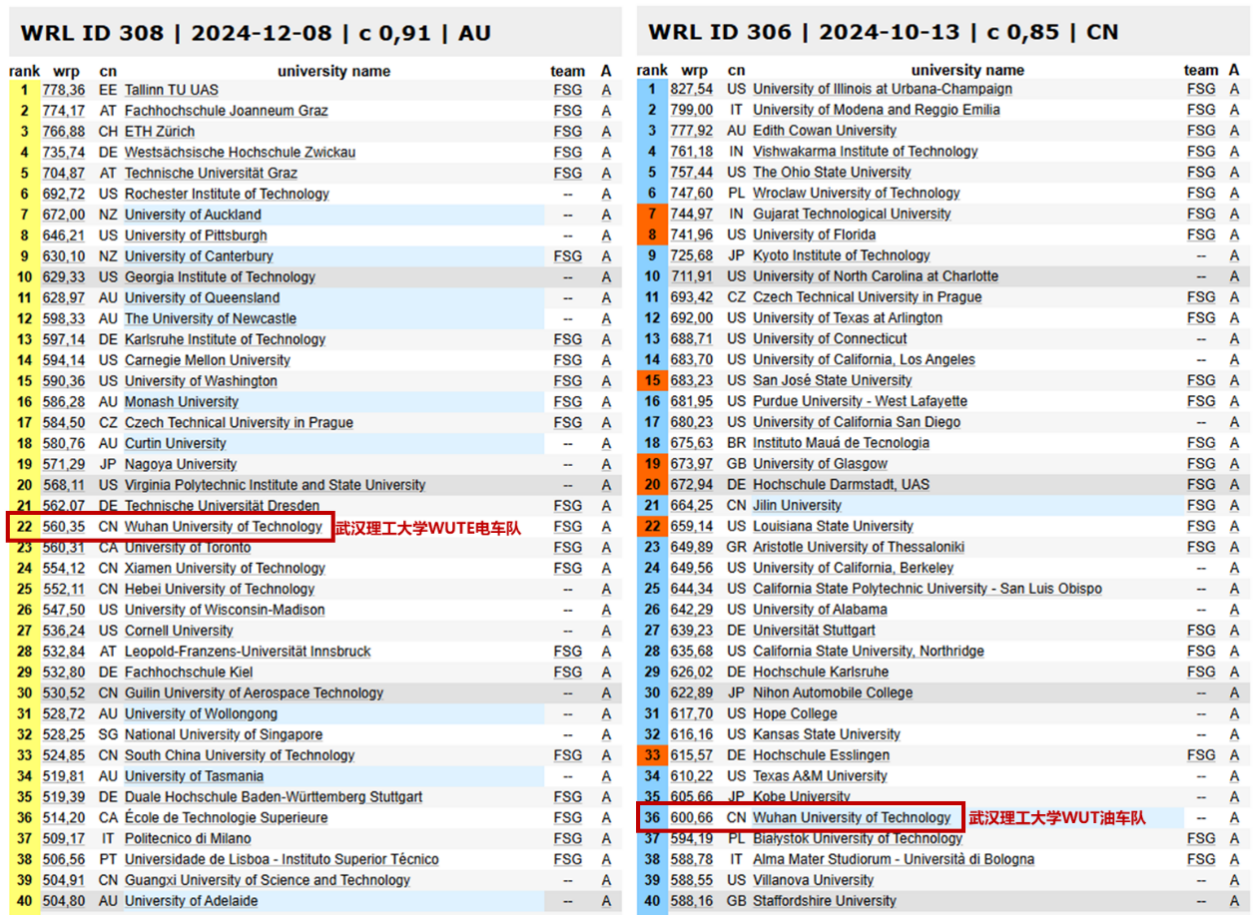 近日,大学生方程式系列赛事2024赛季世界排名发布:武汉理工大学获得电车组别中国车队第一、世界第22,油车组别中国车队第二、世界第36。