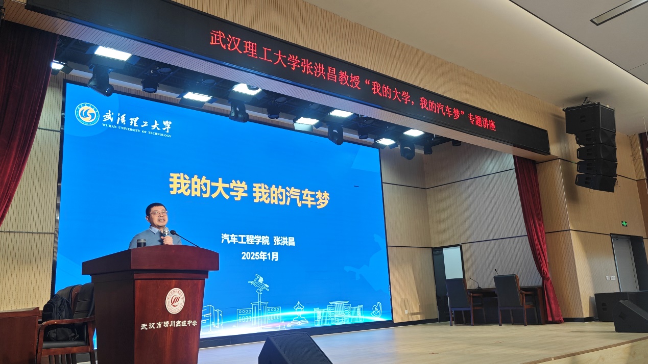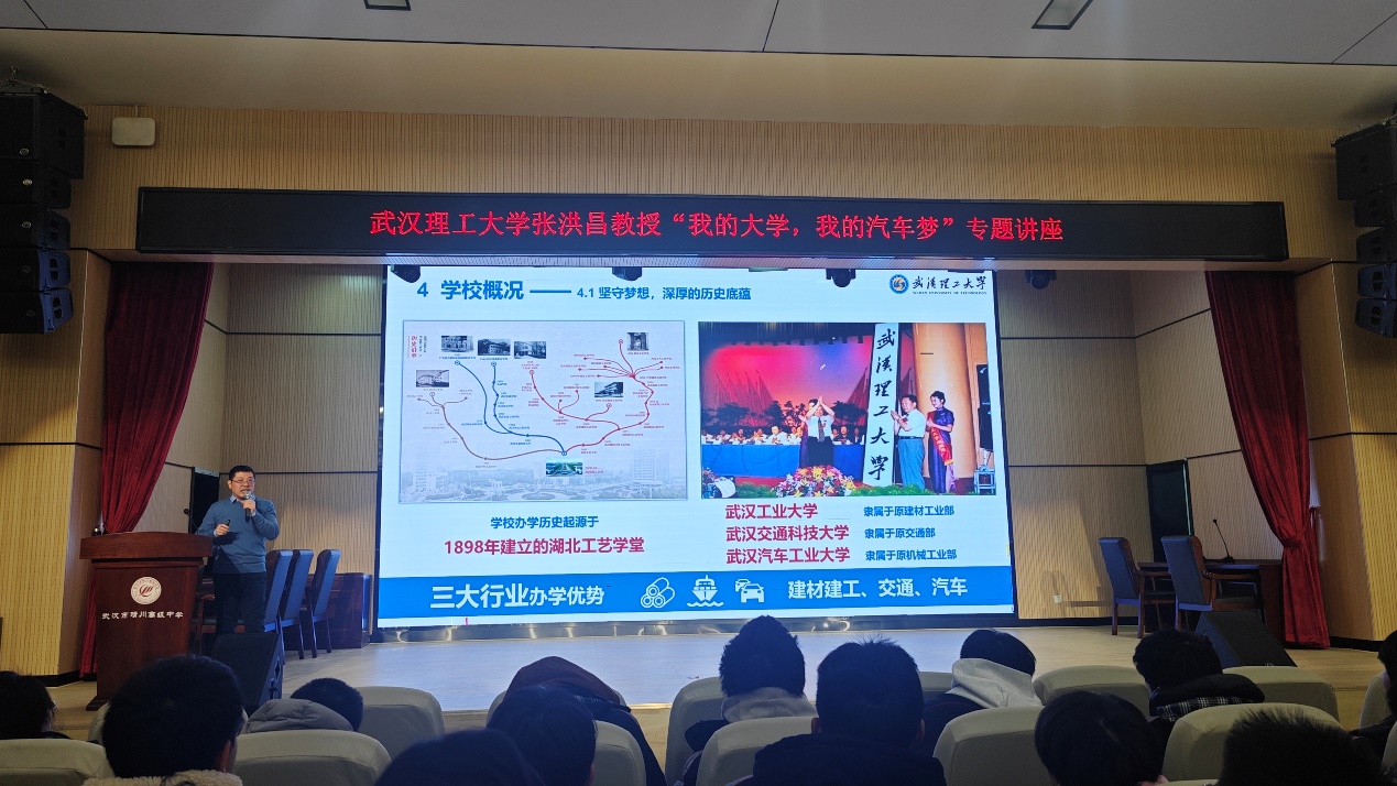 活动伊始,张洪昌老师以“我的大学,我的汽车梦”为题,向晴川高级中学的同学们开展讲座。张洪昌老师先是从“汽车的起源”讲起,通过丰富多样的视频材料,向同学们详细描绘了从燃气汽车再到电动汽车的几大发展历程,展现了汽车领域的技术革命。第二部分是“中国汽车梦”,张老师讲述了新中国成立后汽车工业的艰难起步,再到如今中国汽车品牌的崛起和新能源汽车的蓬勃发展,以及近年来中国汽车品牌在全球市场上的亮眼表现。在张老师的讲述下,同学们无不为中国汽车工业的坚韧与毅力所感动。第三部分是“智驭未来行”,张老师介绍了人工智能技术在汽车行业的应用,如自动驾驶、智能网联和电动化趋势等。张老师指出,随着技术的不断进步,汽车行业正迎来前所未有的变革。他鼓励学生们积极拥抱新技术,努力学习专业知识,为未来的汽车行业贡献自己的力量。讲座结束后,张老师与现场学生们开展问答环节,现场同学积极参与,气氛热烈。