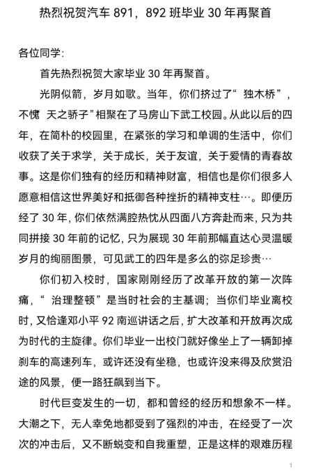 期间,由余晨光校友宣读温毅老师百忙之中发来的贺信,娓娓道来,情真意切!